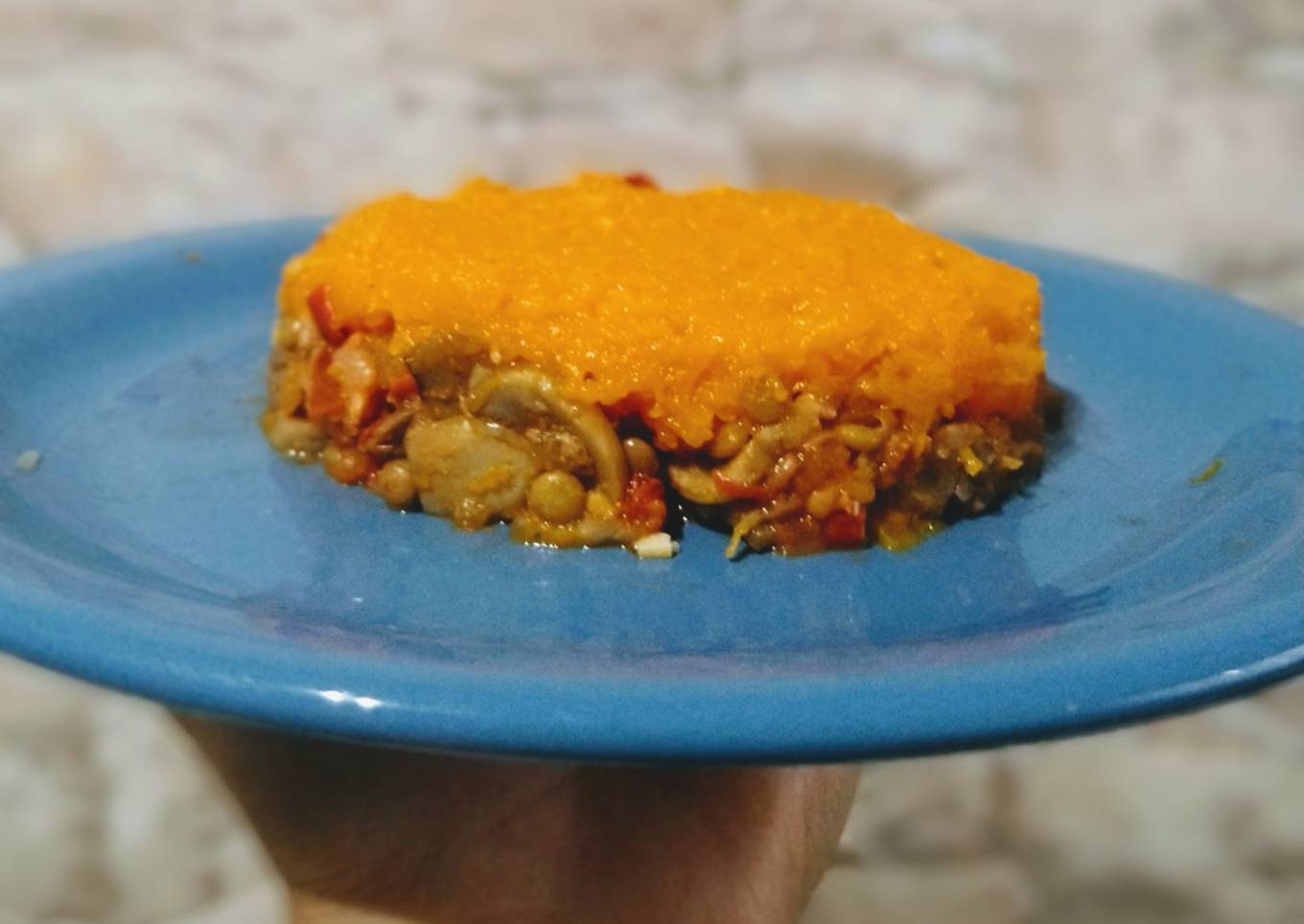 "Pastel" de calabaza, lentejas y champiñones