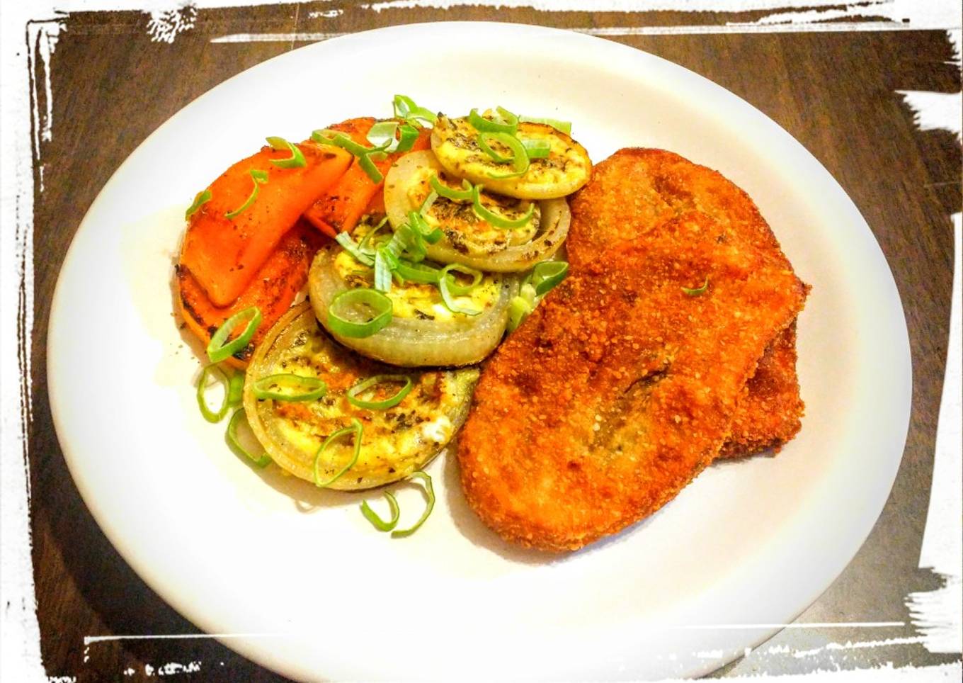 Milanesa de Berenjena, Aros de Cebolla con Huevo y Calabaza