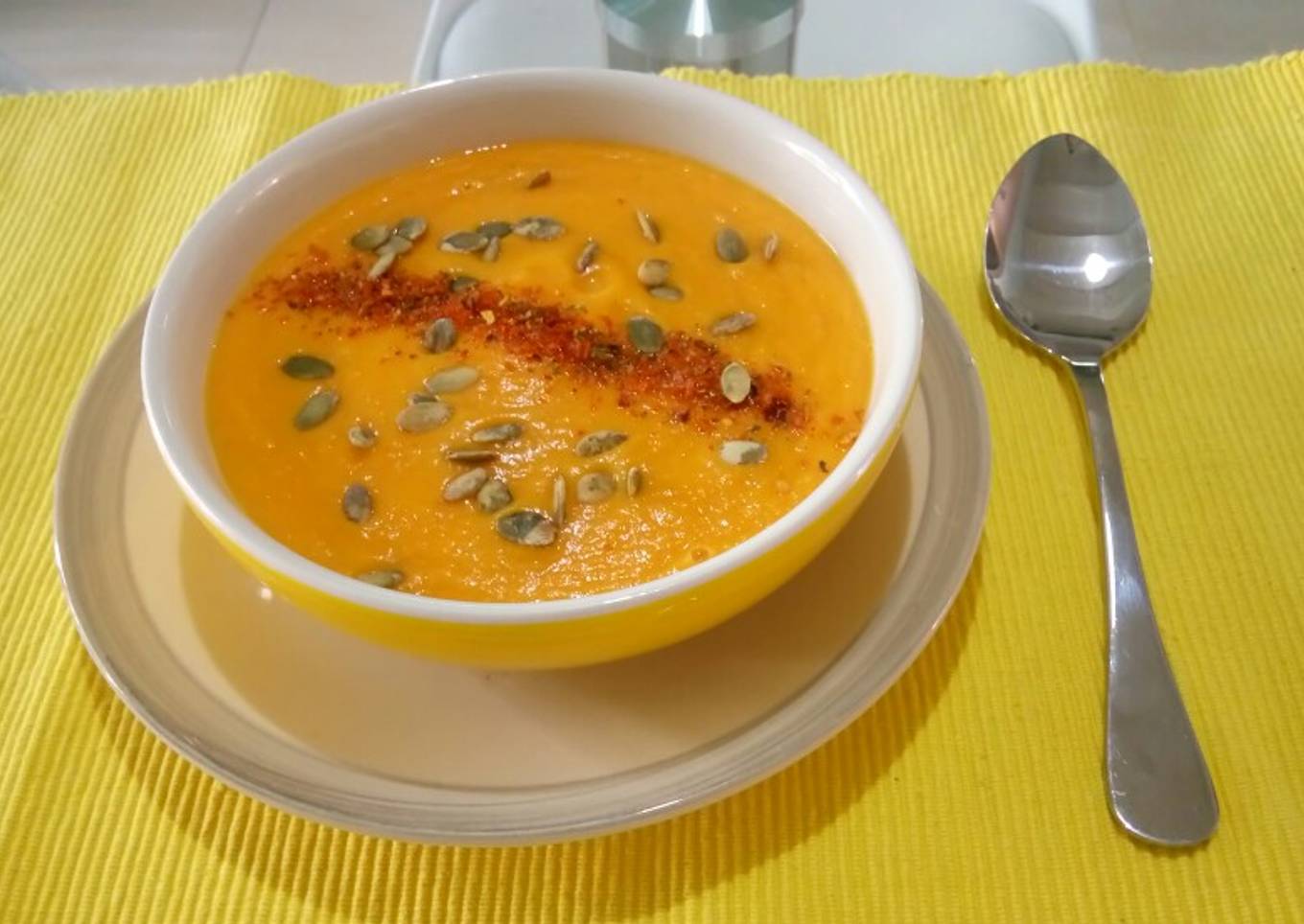 - Cortar la calabaza (como prefieras) condimentar a gusto y llevar al horno medio por aproximadamente 40', mientras rehogar la cebolla en una cacerola cuando l calabaza este lista (blanda) agregar el agua a las cebollas y la 🎃. Hervir unos minutos, retirar y procesar con un robot de cocina. Servir caliente y decorar con semillas de 🎃. (también puedes agregar crema de leche y/o queso)