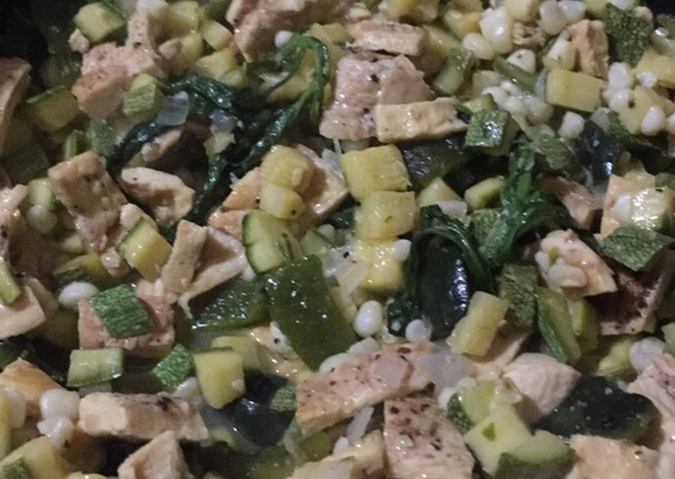 - Fríe la pechuga de pollo y corta en pequeños cuadros, reserva, en una cacerola acitróna la cebolla picada y el ajo, añade los cubitos de chile poblano y fríe, añade la calabacita picada, el elote de preferencia ya cocido, las ramas de epazote y sazona con pimienta y el consomé. Tapa y a fuego muy bajo deja cocer las calabacitas, una vez cocidos añade la pechuga y deja hervir 5 minutos más y listo!!!