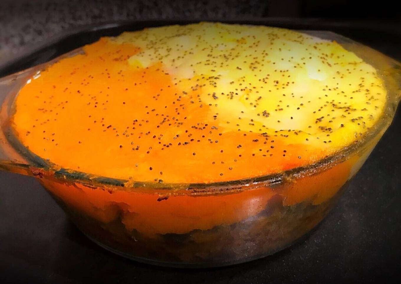- Agregar arriba la mitad puré de calabaza y la otra mitad puré de papa.