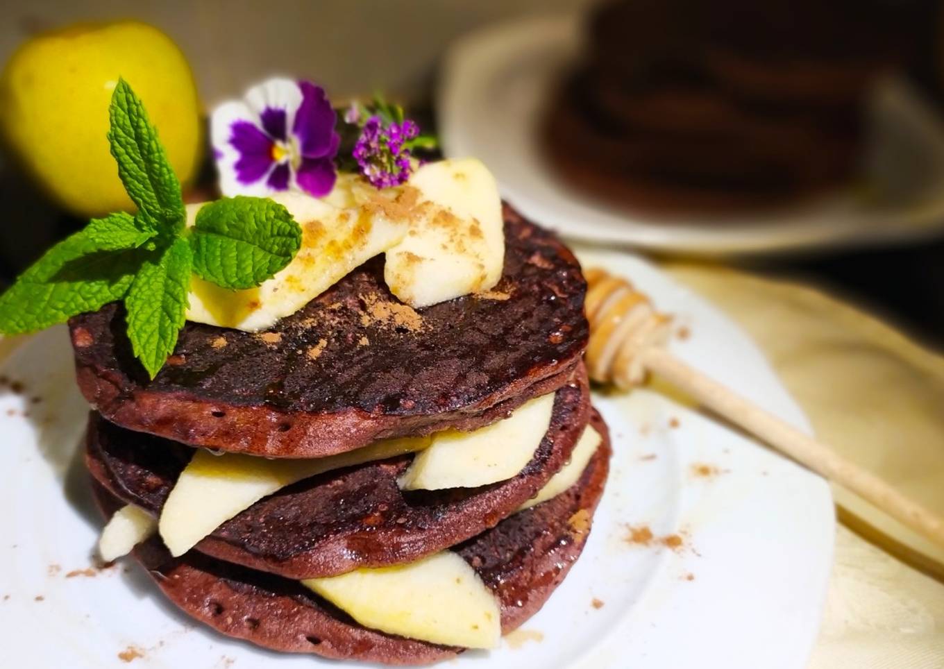 - Pelamos, quitamos el corazón y cortamos a láminas las otras 2 Manzanas. Montamos nuestra elaboración, colocando 1 Tortita en el plato, luego la Manzana, Menta y Miel. Hacemos lo mismo con 2 Tortitas más y espolvoreamos Canela por encima. Servimos de inmediato.